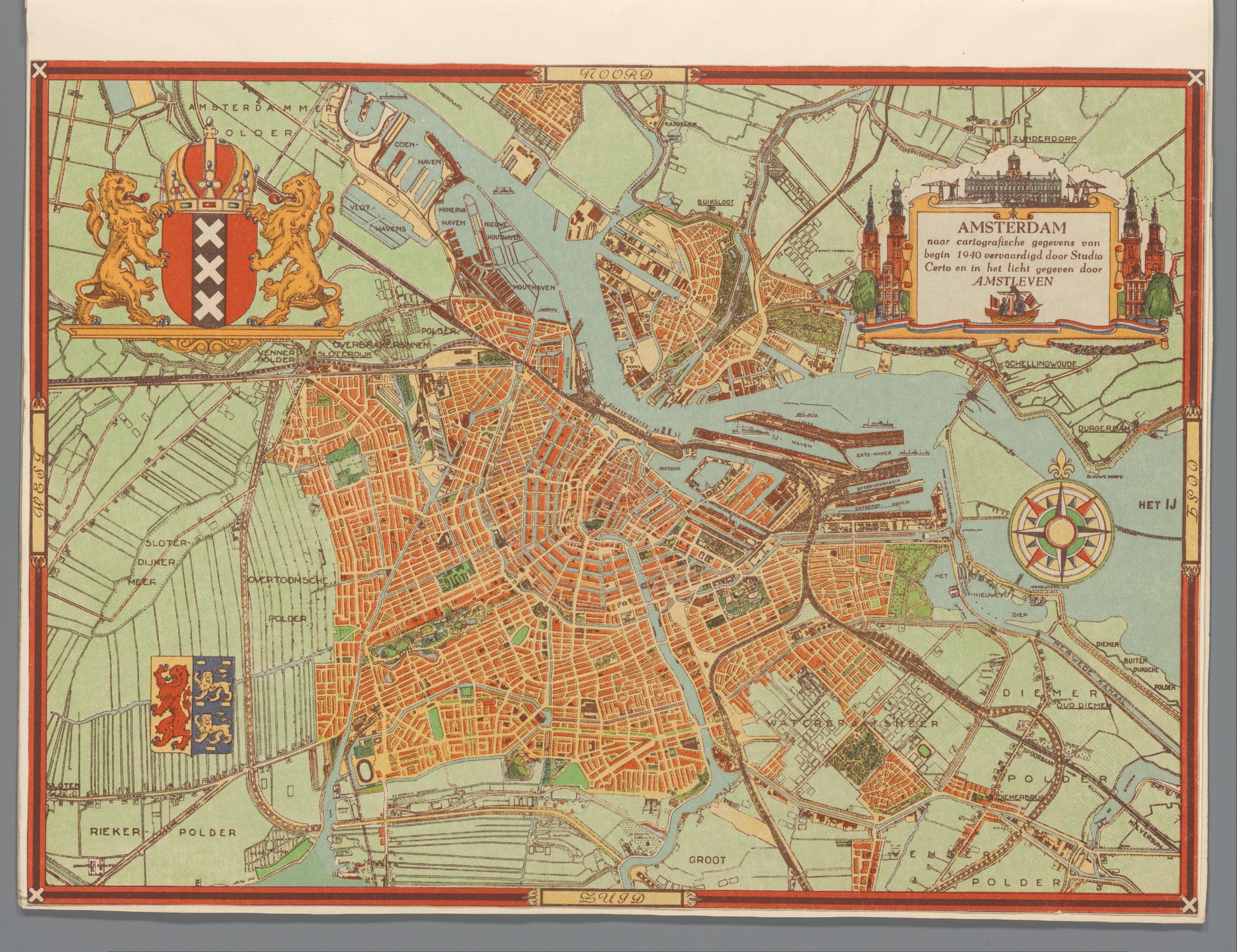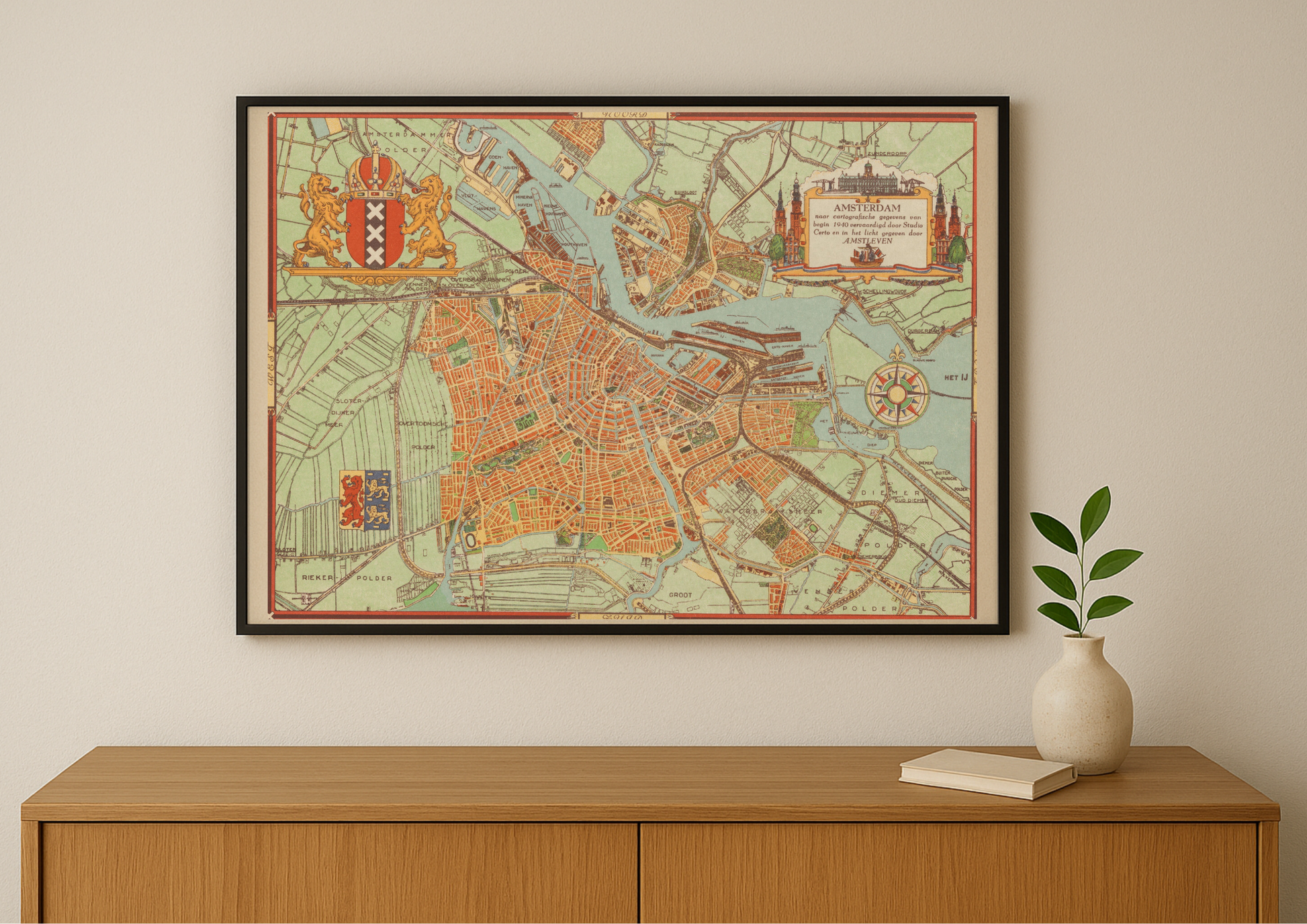Ontdek Amsterdam zoals het was in 1940 met deze Kaart van Amsterdam. Een heldere historische weergave van de stad in een tijdperk vol veranderingen. Perfect voor liefhebbers van Amsterdamse geschiedenis en voor iedereen die houdt van authentieke stadskaarten als stijlvolle wanddecoratie.